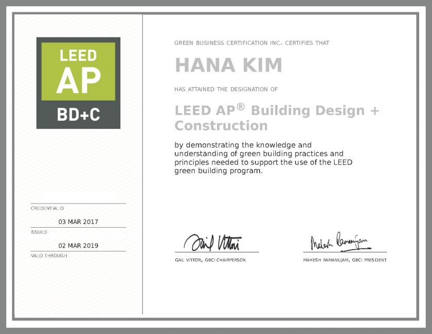 건설회사를 다니면서 친환경 건축하면 공사비 늘어나는 소리라고 막연하게 생각하고 있었습니다. LEED AP 자격시험을 준비하면서 예산을 많이 쓰지 않고도 친환경적인 건축물을 지을 수 있는 방법들을 알게된 것 같고 친환경건축에 대해 체계적으로 공부할 수 있어서 좋았습니다. LEED AP 자격 취득을 했으니 더 친환경 건축에 대한 제안을 활발히 해야겠다는 생각이 들었습니다. |