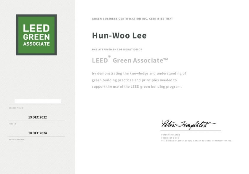 2020년도에 혼자 공부를 하기에는 어려운 자격증분야이어서 인터넷으로 학원을 알아보던중 그린로그를 알게되었고, 때마침 자격증 취득시 상품권을 준다는 이벤트가 있어서 종합반으로 등록해서 공부를 시작함. 공부시작전 LEED 시험을 가볍게 여기고 바로 시험을 GA+AP하루에 보는 COMBIND로 등록해놓고 공부를 시작하였으나, 바쁜 업무관계로 공부를 하지 못하고, 2020년도의 시험을 치르지 않았음. 그 후 LEED를 잊고 지내다가, 2022년 12월 1년 계획을 돌아보며 해 놓은게 없다는 생각으로 가장 먼저 할 수 있는 GA 시험에 합격할 것을 목표로 다시 시작함. GA 공부기간은 약 3주이며, 그린로그 원장님 강의를 2회 듣고, 학원교재인 600문제를 2회 풀었다. 몇일 시간이 남아 유투브에 있는 GA 예제를 몇백문제 풀고 2022년 12월 19일 시험을 치러가서 191점으로 합격하였다. GA는 인테넷에 무료 자료가 많아 다운받아 풀어봄으로써 학원교재 + 폭넓은 문제 이해도를 가질수 있어서 시험이 쉽게 여겨졌다. |