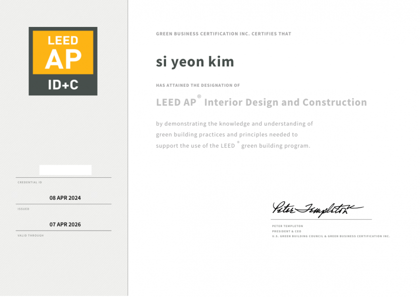 | 나만의 공부계획 및 전략 | 인강은 1회독에 이해가 가지 않는 부분 2회독했고, 그린로그에서 제공하는 문제집 4회독 했습니다. 교재말고도 USGBC에서 무료로 배포하는 PDF들도 찾아서 공부했는데, 이 부분에서 의외로 문제가 많이 나왔던 것 같습니다. Commercial interior, retail, hospitality별로 받을 수 있는 크레딧을 안보고 적을 수 있을 만큼 세세하게 다 암기했고, 홈페이지에 나와있는 합격 후기가 큰 도움이 되었습니다. 대부분 BD+C 후기들이라 살짝 다른 부분도 있었지만, ID+C와 중복되는 내용들이 많기에 추후에 BD+C 취득이 어렵지 않다고 생각합니다. |
